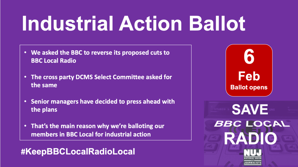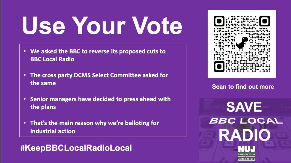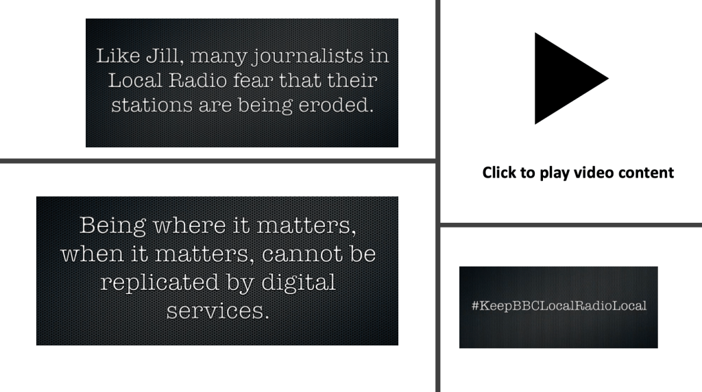 Once the hashtag #KeepBBCLocalRadioLocal was established, we created a graphic that could be used in a variety of communications settings – from stakeholder briefings to a visual cue on NUJ messaging to its membership. The visual used familiar colours from the BBC’s own Local Radio family – aligning the message from the Union, but without infringing any copyrights or trademarks belonging to the BBC.